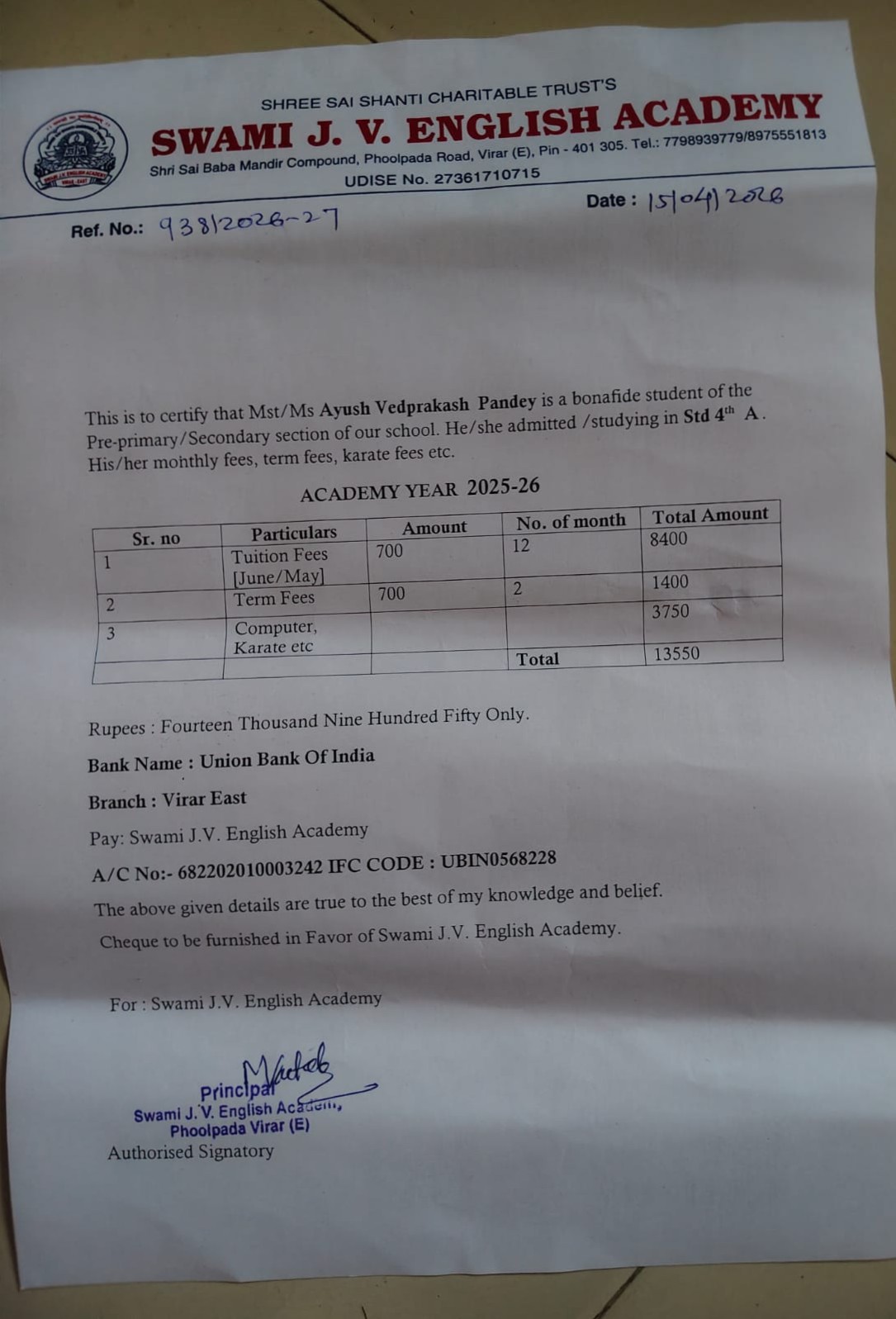 Ayush Vedprakash Pandey, a bright and hardworking student studying in Std 4th (A) at Swami J. V. English Academy, is at risk of discontinuing his education due to financial constraints.