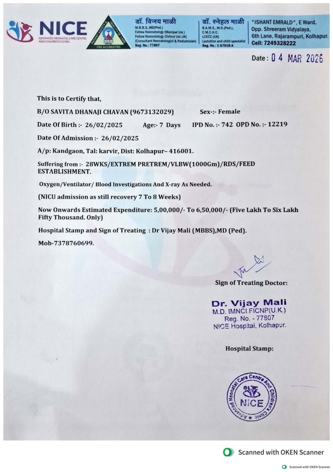 Baby of Savita Dhanaji Chavan 🏥 Medical Condition Premature Birth: 28 Weeks Weight: 1000 grams (Very Low Birth Weight) Condition: Extreme Preterm RDS (Respiratory Distress Syndrome) Feeding Establishment Issues Currently in: NICU (Newborn Intensive…